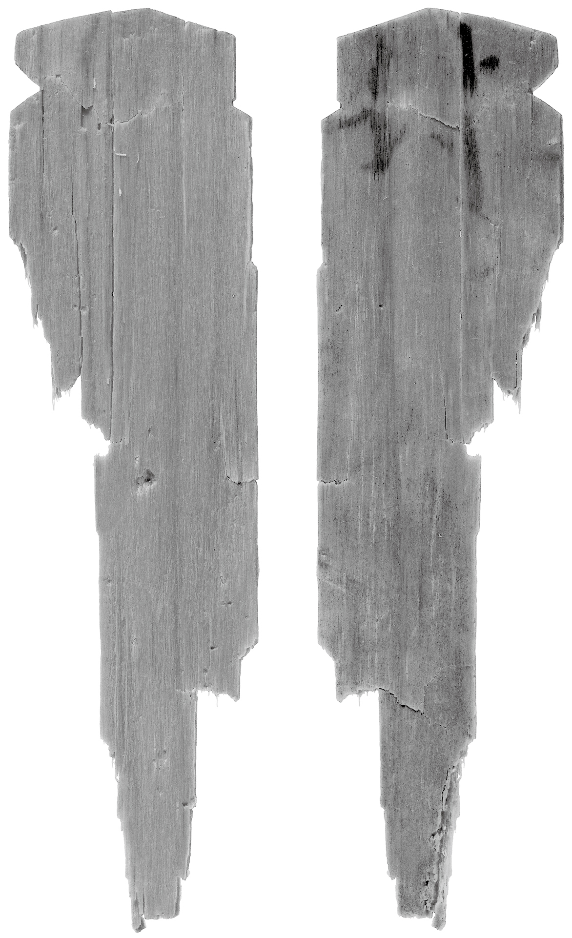 二片接続、上削り、下欠(折れ)、左削り、右削り。左辺下部にも切り込みの痕跡あり。裏面未調整。平城京3-4989・4993は同一の封緘木簡の表簡上部と裏簡下部の可能性あり。 |