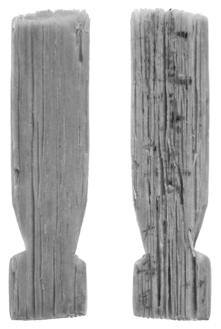 上端が二次的切断、下端が二次的削り、左右は削り。下部の左右に二次的な切り込みを入れる。元は考課、あるいは考選木簡として使用したものを二次的に加工したと考えられる。「大倭国」の表記は、天平9年(737)12月丙寅(27日)条で「大養徳国」に改称され、天平19年(747)3月辛卯(16日) 条で再び「大倭国」となり、天平宝字2年(758)2月己巳(27日)条より以前に「大和国」と改称されている(『続日本紀』)。中層から出土。 |