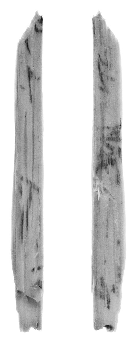 上端が切断、下端は折れ、左右は割れ。横材で中層から出土。何らかの帳簿の一部。 |