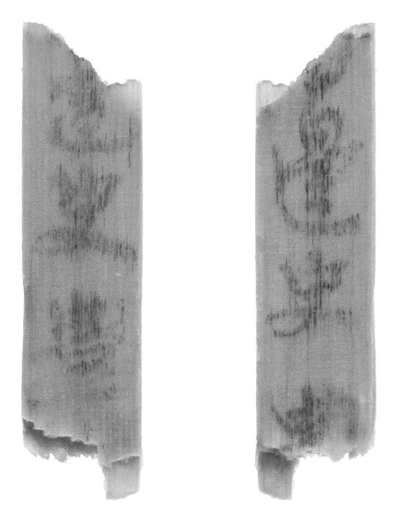 上下折れ、左右削り。両面に同一の人名を記す。「田辺史」は河内国安宿郡に本拠地を持つ渡来系氏族である。中層から出土。 |