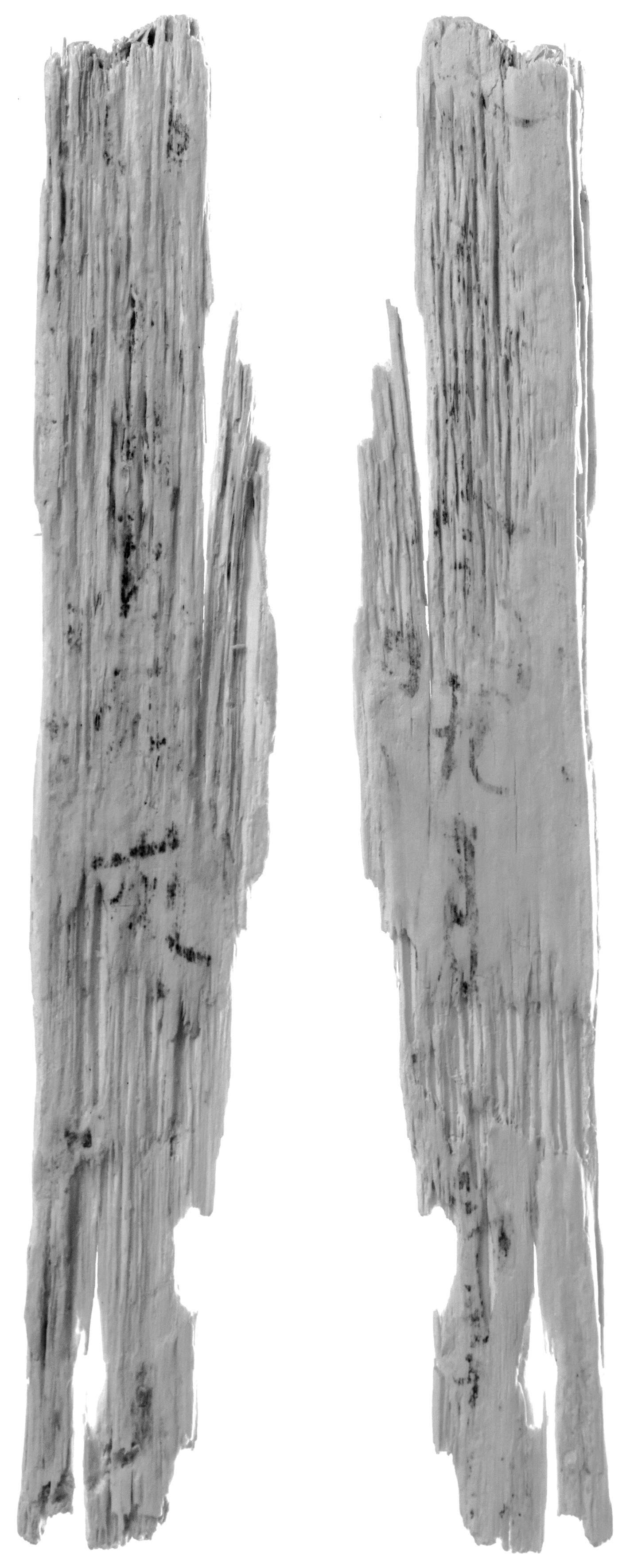 木簡説明 腐敗著しく、表面の一部および裏面の下半部は剝離する。上端折れか、下端折れ、左辺割れ、右辺削りか。板目。