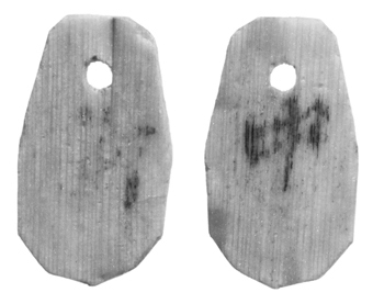形状 四つの角を丸く削り、上部中央に穿孔する。